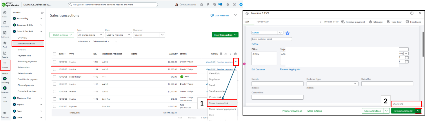 First, you can share an invoice link through the Action dropdown from the Sales Transactions page. Let me guide you how: