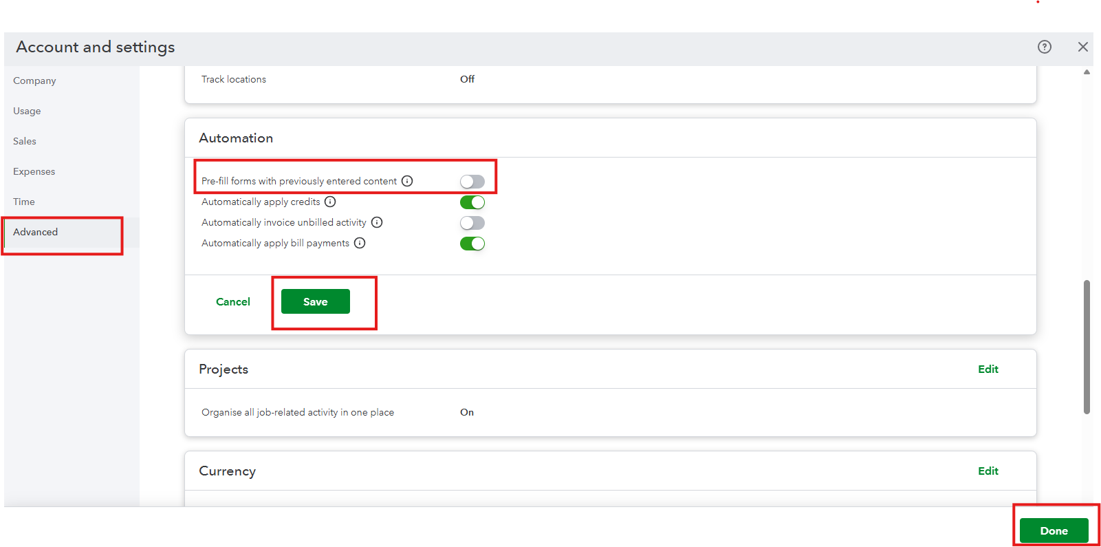 To start, please note that disabling this feature ensures QuickBooks will no longer automatically populate fields with data from previous transactions tied to the contact.