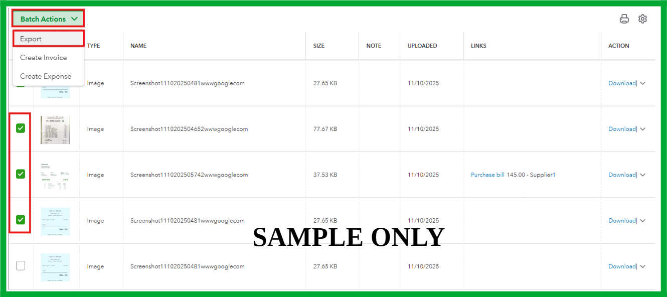 - Select the receipts you want to download, then hit the Batch Actions dropdown.