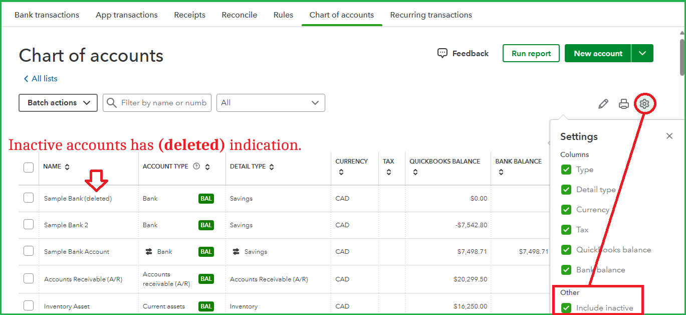 If you want to access an inactive account from your Chart of accounts (COA), you'll need to enable the Include inactive option. Doing so ensures they'll be visible on the list.