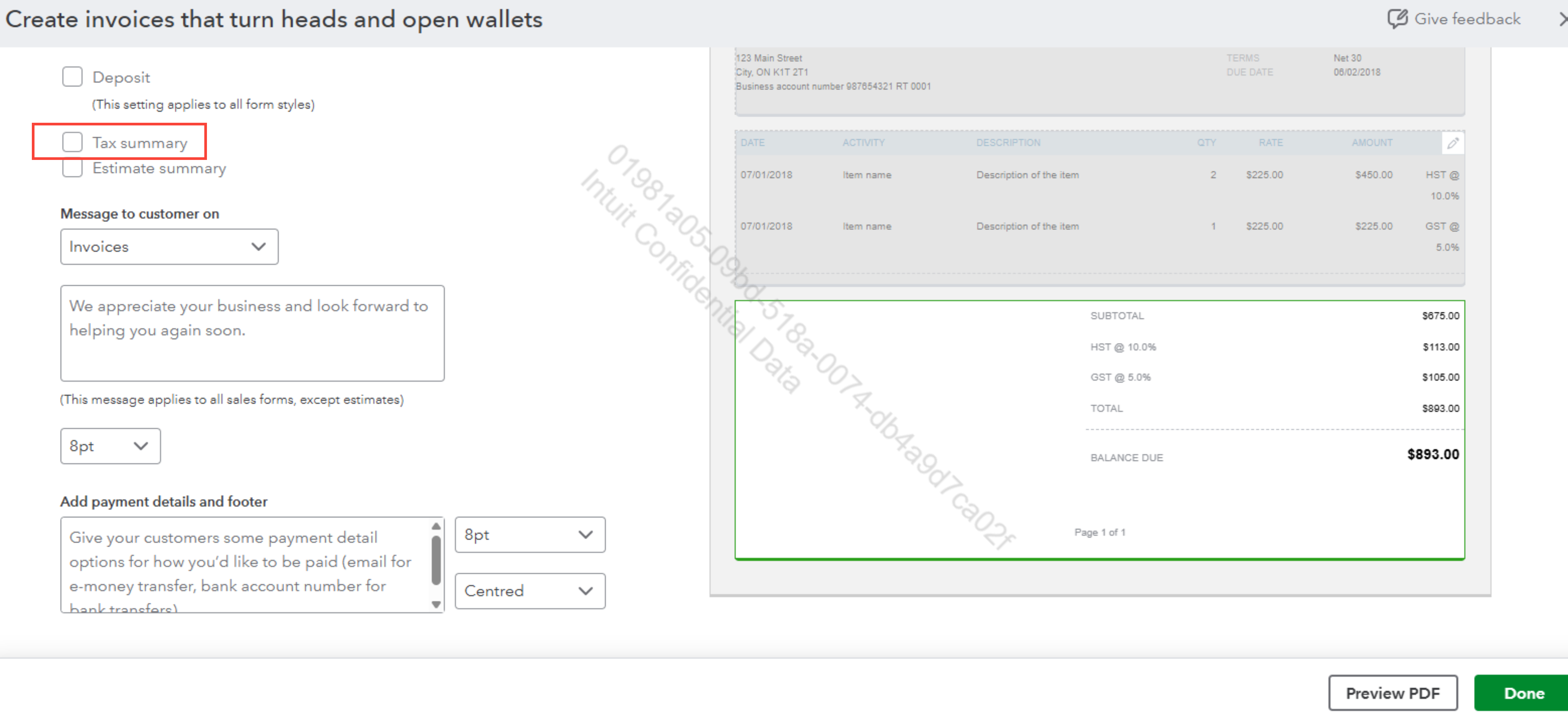 You can hide the Tax Summary at the bottom of the invoice by following these steps below: