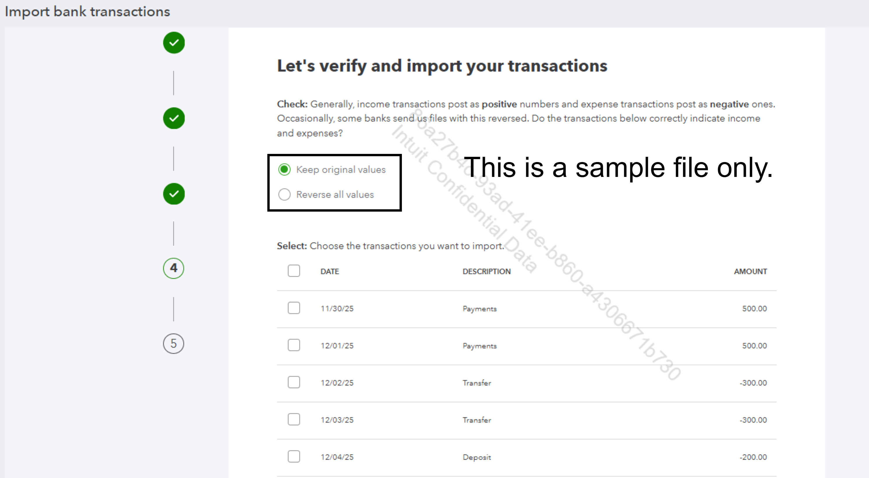 First, you'll have to review the Amount column. In your CSV file, let's ensure that payments (expenses) are entered as negative values, while deposits (income) should be entered as positive values.