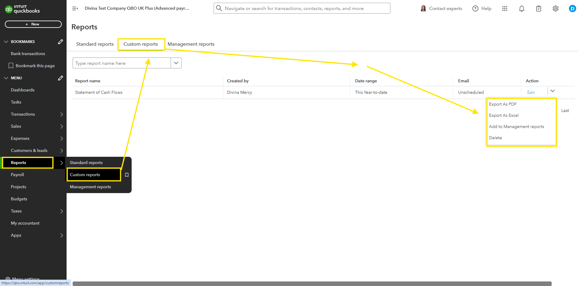 - Then, locate your saved, custom Statement of Cash Flows report under the Custom reports tab.