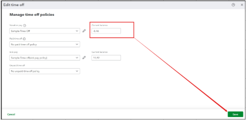 When you click Edit, this action should seamlessly direct you to the Manage time off policies section, where you can make adjustments to the balance as needed. I'm sharing a screenshot for your visual reference: