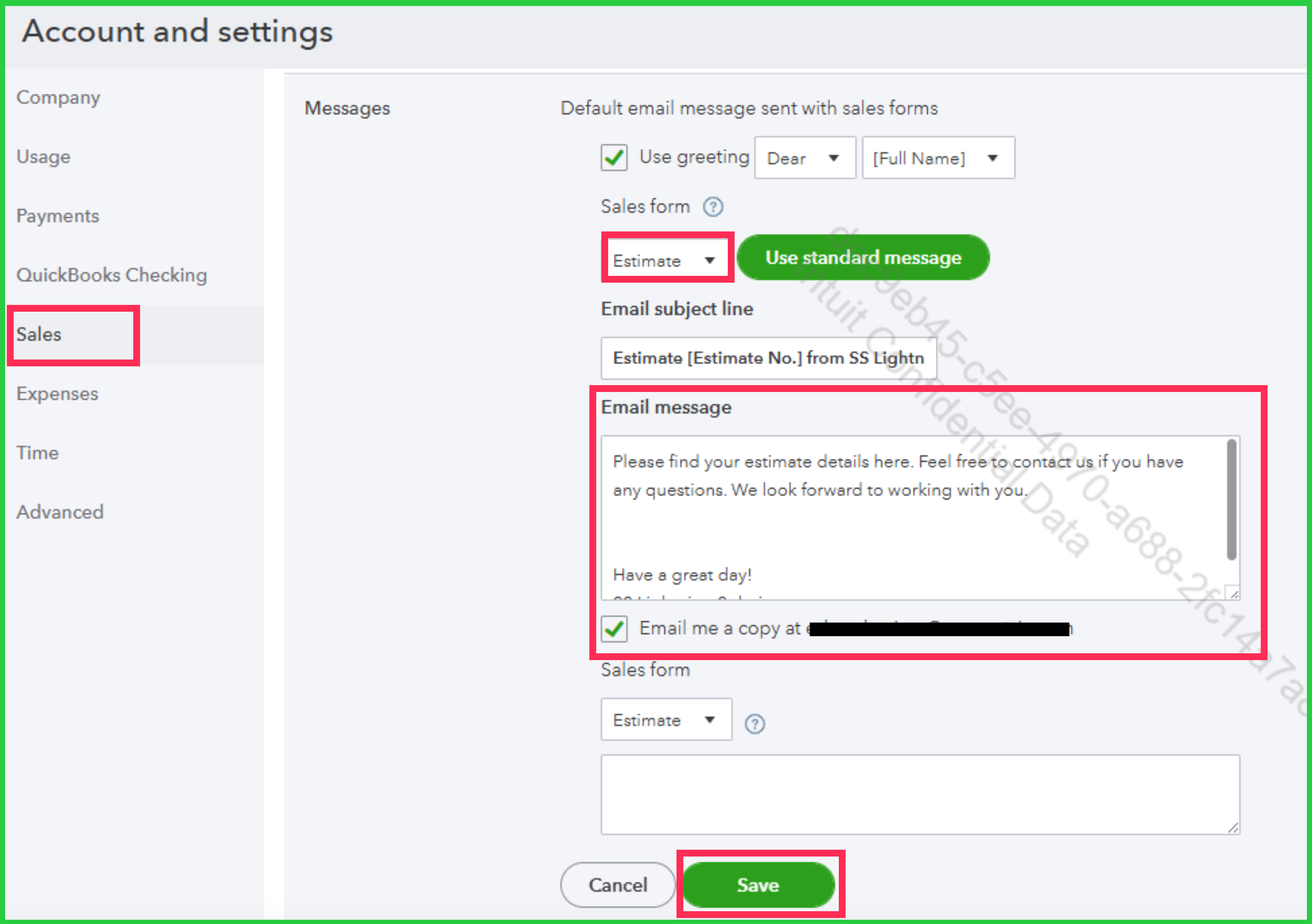 3. Choose Estimate from the Sales form dropdown, then customize the content in the Email message textbox. Optionally, check the Email me a copy option to receive a copy.