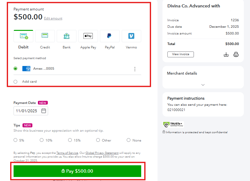 Once activated, you can review them in the Payments options when creating invoices. Then, advise them to click the View and Pay link in the invoice email. For more details about the process, open this link: Receive and process payments.