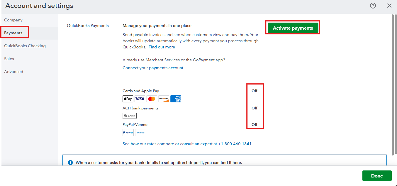 Before doing so, ensure that you have an active payments account so your customers can pay online. To use QuickBooks Payments, your account must meet eligibility criteria and undergo credit and application approval. If you haven't already, sign up for QuickBooks Payments.