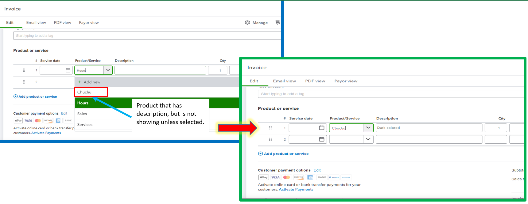 Buy nowWhen invoicing the product description used to show up when entering a product/service. My product codes have no logic so I need to see the description in order to know which one to select. Under the new layout, the description no longer shows. Is there a way to fix this?