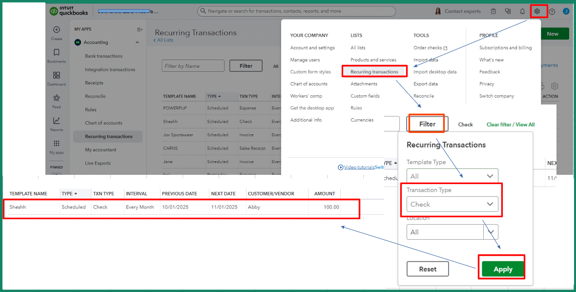 Start by clicking the Gear icon in QuickBooks Online to locate your recurring check, Anita.