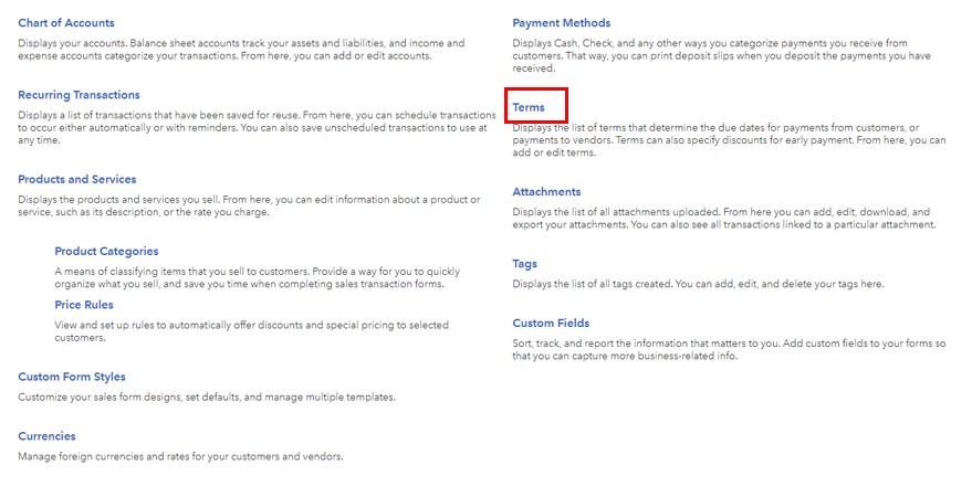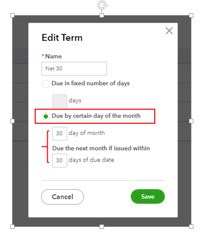 Is there any particular way I can enter the terms in properly in the "Bills" section? I can only figure out how to add fixed number of days and the due date for that particular month, but not the next month.