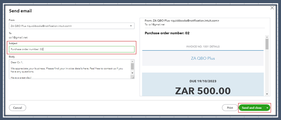 I am looking for a way to include the PO# on the subject line after Invoice# when I am sending invoices so that it would be easier on my customers end to search on email.