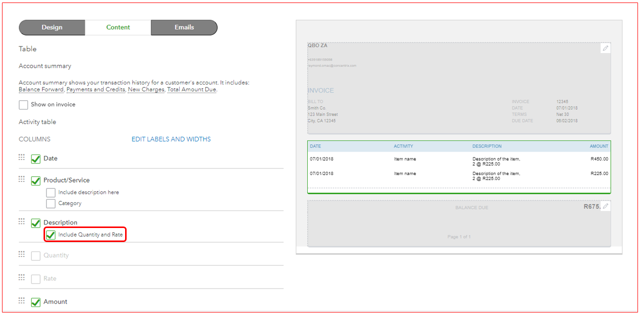 Please note that quantity and rate can be included under the Description column. If you check the Include Quantity and Rate box on your template, you won't be able to see separate columns for Quantity and Rate.