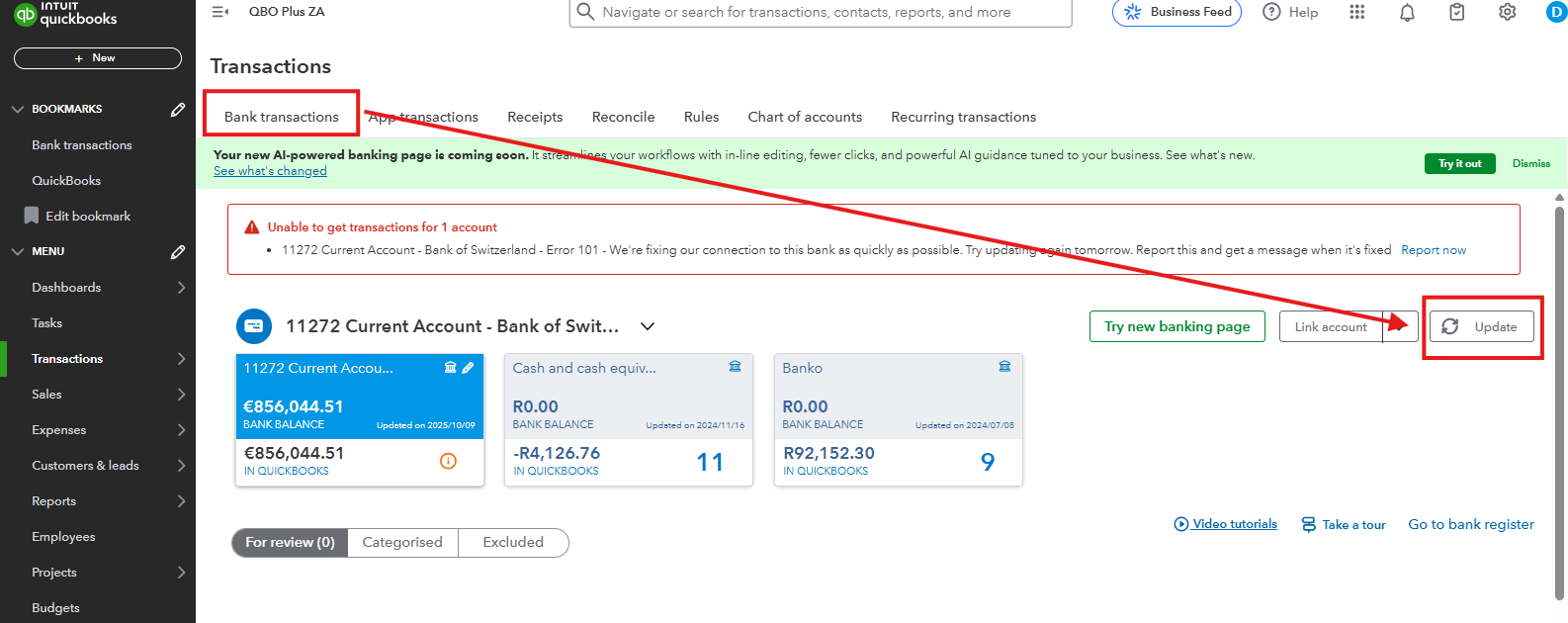 The first step is to log out of your account, refresh your browser, and then log in again. Within the Bank Transactions page, click the Update option on the right side to refresh all your connected bank accounts and download the transactions.