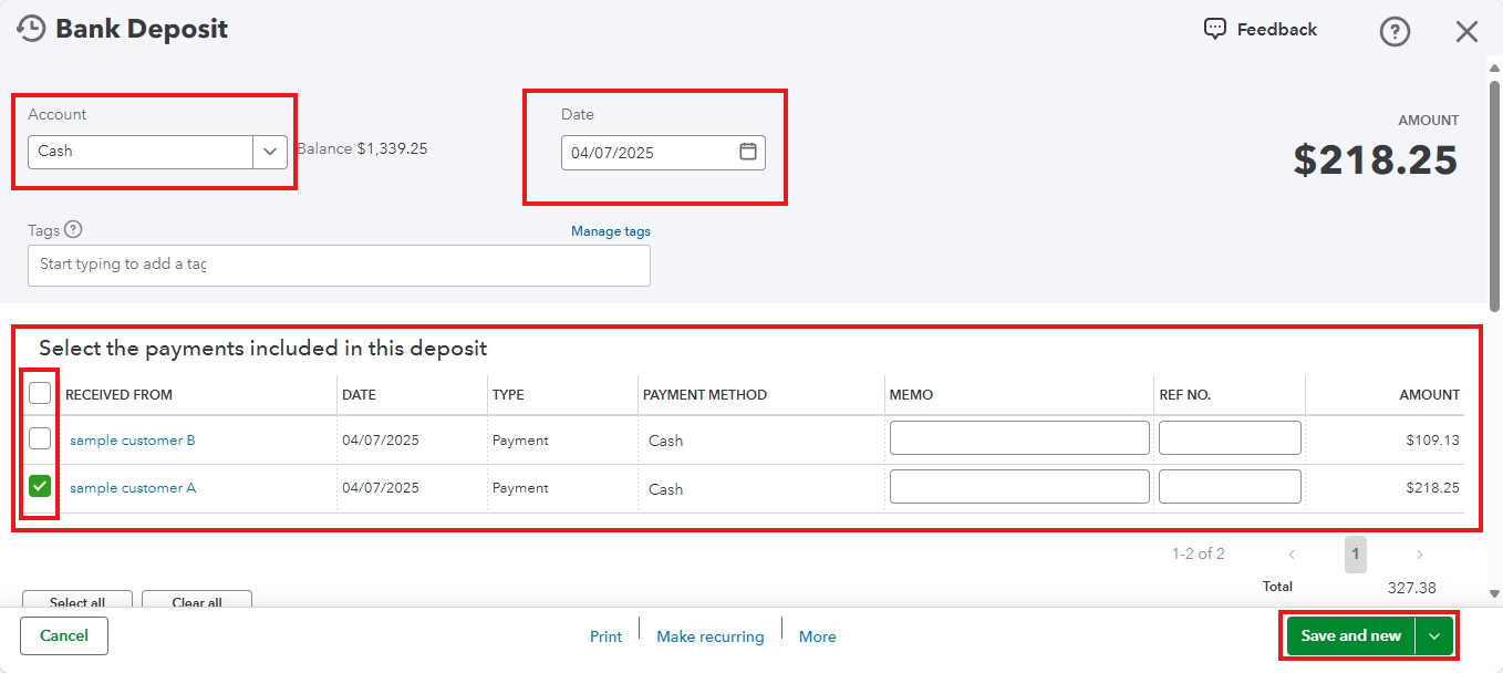 - Under the Select the payments included in this deposit section, place a checkmark for the customer payment that was unlinked from the previous deposit.