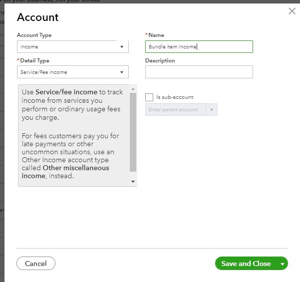 Once done, create a Liability Account to track the vendor commission that is owed. NOTE: You’ll want this to be an Other Current Liability, and you’ll need one for each vendor to whom you pay commission. Then, create the item(s) for which your vendor is earning a commission. Make sure you point this to the proper Income Account. Your item will either be Inventory, non-inventory, or service, depending on what you’re selling, so choose the item type as needed. While you’re still in the Products & Services list screen, create a new SERVICE item to track the vendor expense and you’ll choose the Commission Expense account you created. Click Save and New when you’re done.