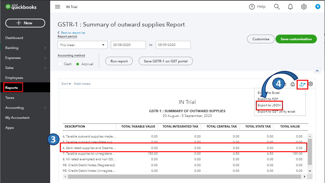When you generate the GSTR report in QBO, you need to review and correct it before exporting it to JSON. This way, you'll be filing an accurate report to the government. Please note that when you choose GST tax rates instead of IGST, Section-6: Zero-rated Supplies and Deemed Exports will show blank IGST rate and amount.