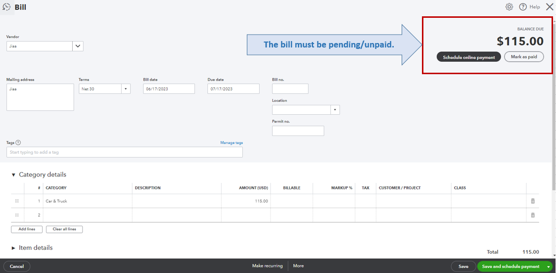 Alternatively, you can delete and recreate your bill to narrow down the result.