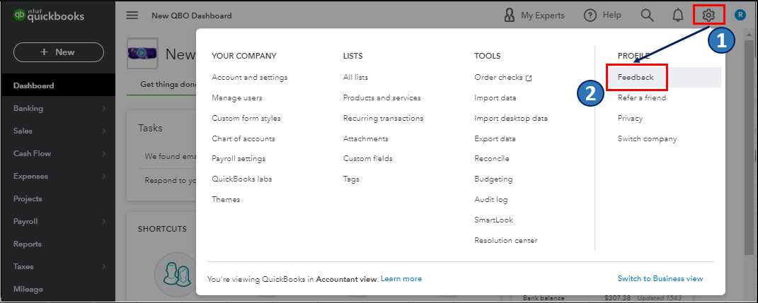 Let's go to the Gear icon's Feedback option so you can suggest functions or product recommendations and help improve the features and your experience using the QuickBooks Online (QBO) software.