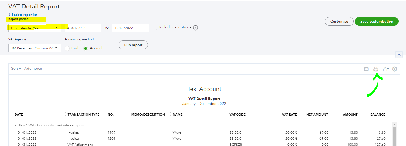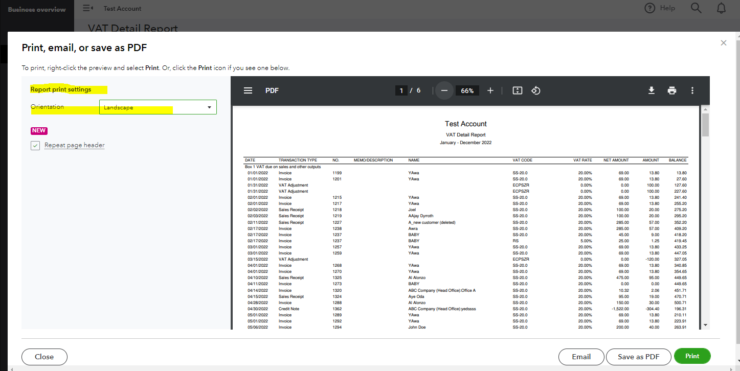 That's it. After following the steps above, click the Printer icon on the top right of your VAT Detail report. You may also need to adjust the Orientation to Landscape under Report print settings. You should be able to print all the details.