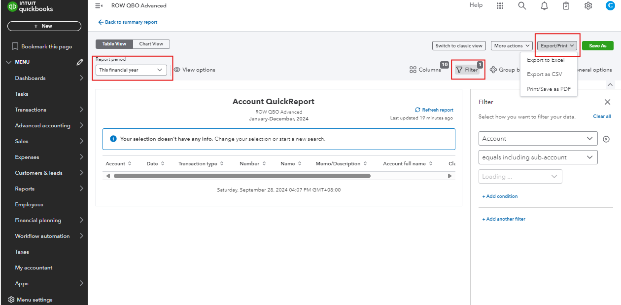 You can generate and customize a report to view recent activities, transactions, and adjustments made for a specific account, such as your Petty Cash account. Here’s how to do it:
