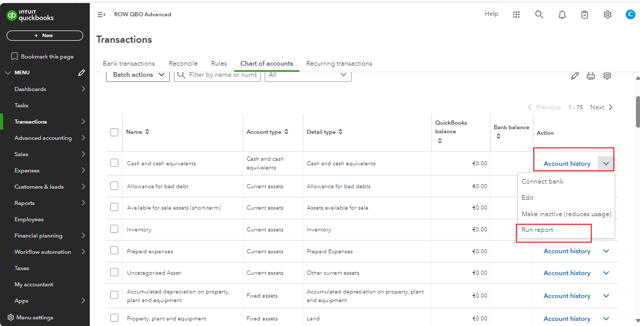 3. Click on the dropdown arrow next to the account and select Run Report.