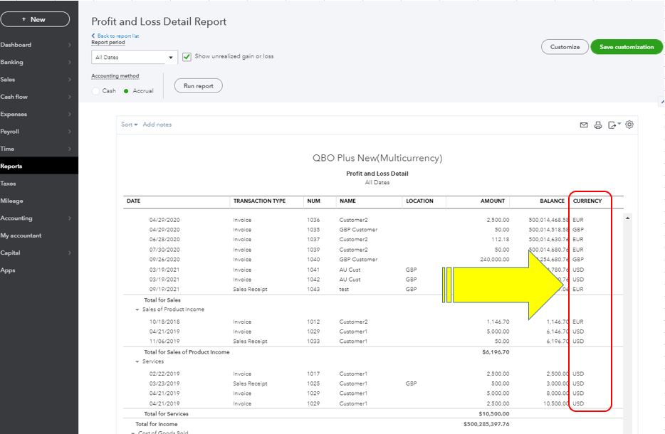 You can use the Profit and Loss Detail Report and filter it to see the currency. Here's how.