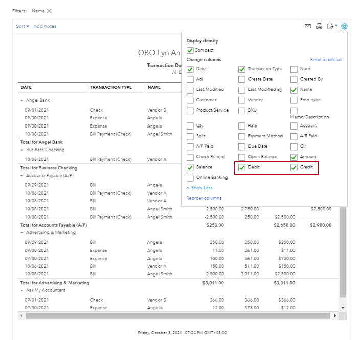 6. You can then go to the small gear icon to select the columns you want to add including the Debit and Credit.