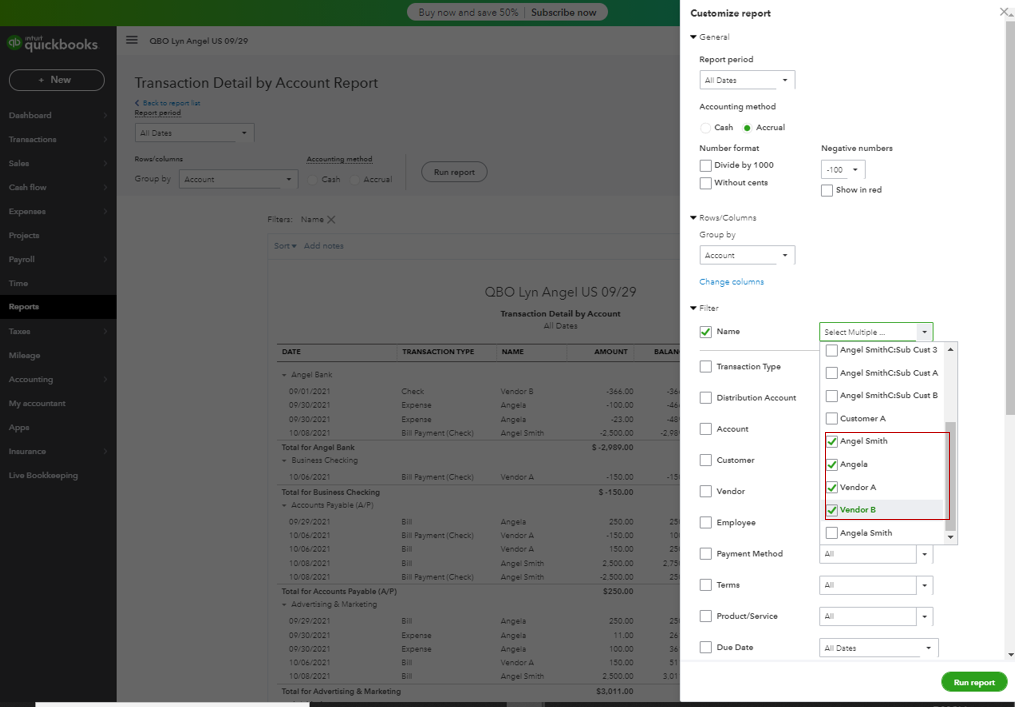 You can pull up the Transaction Detail by Account report to see your supplier or vendor's statement with the debit and credit information. I'll guide you on how to customize the report.